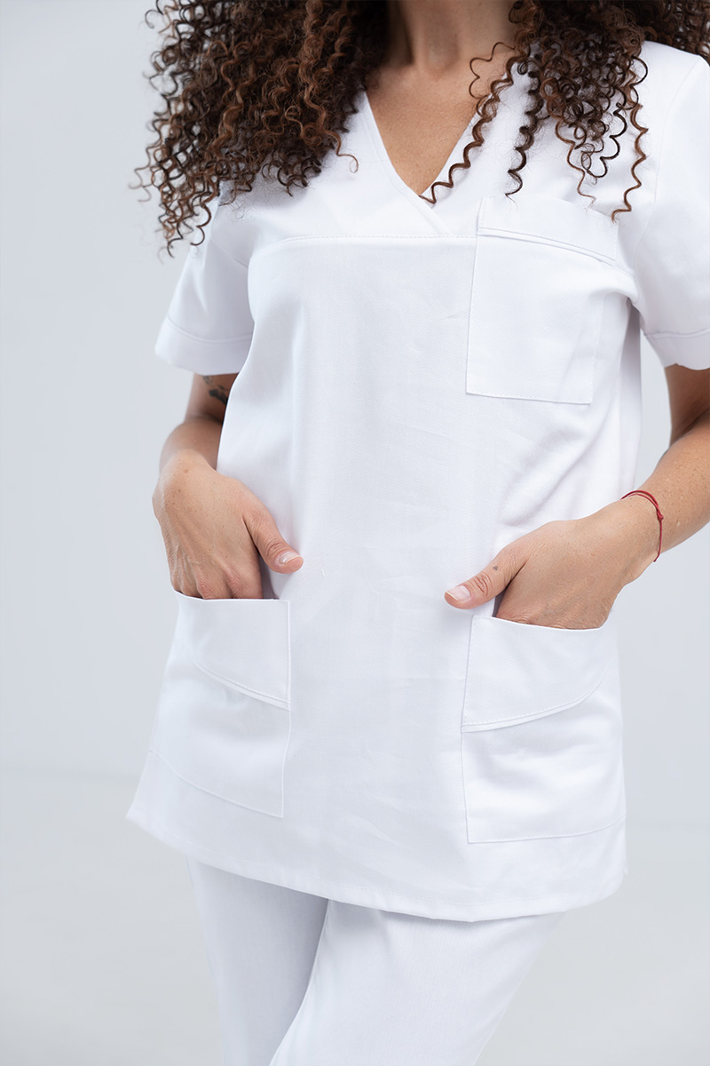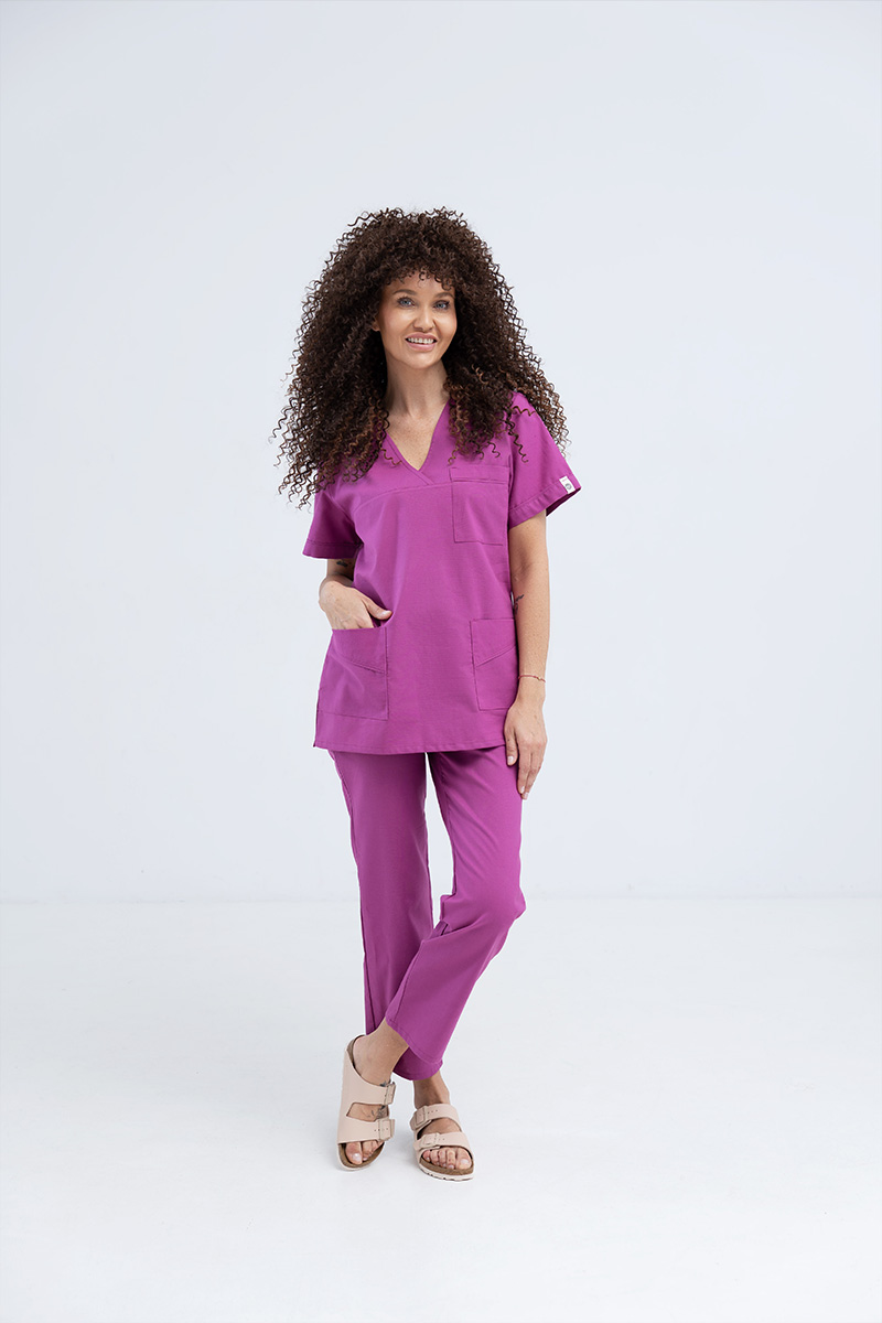 Model W20 eco posiada dobrze znane i cenione cechy klasycznej wersji: dekolt w kształcie litery V, trzy praktyczne kieszenie (dwie na wysokości bioder i jedną na piersi) oraz delikatne rozcięcia po bokach, które zwiększają swobodę ruchów. Krój jest lekko dopasowany, co pozwala zachować estetyczny wygląd bez ograniczania komfortu. Bluzy medyczne damskie z kolekcji ECO dobrze układają się na sylwetce i świetnie komponuje się zarówno z klasycznymi spodniami, jak innymi modelami. To doskonały wybór dla lekarzy, pielęgniarek, fizjoterapeutów, kosmetologów oraz wszystkich osób pracujących z pacjentem lub klientem, dla których ważna jest funkcjonalność, schludny wygląd i wygoda noszenia przez wiele godzin.